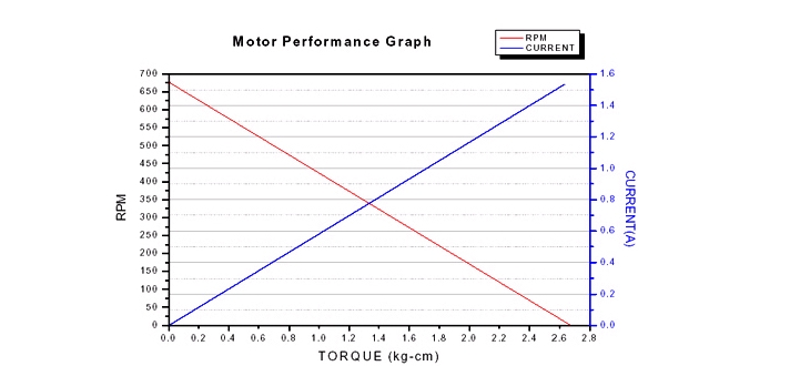 X축을 Torque로 Y축을 RPM과 전류로 했을 때 모터에 걸리는 Torque(부하)가 커질수록 RPM은 선형적으로 반비례하여 감소한다. 전류는 부하가 커질수록 비례하여 커지는 것을 볼 수 있다.
