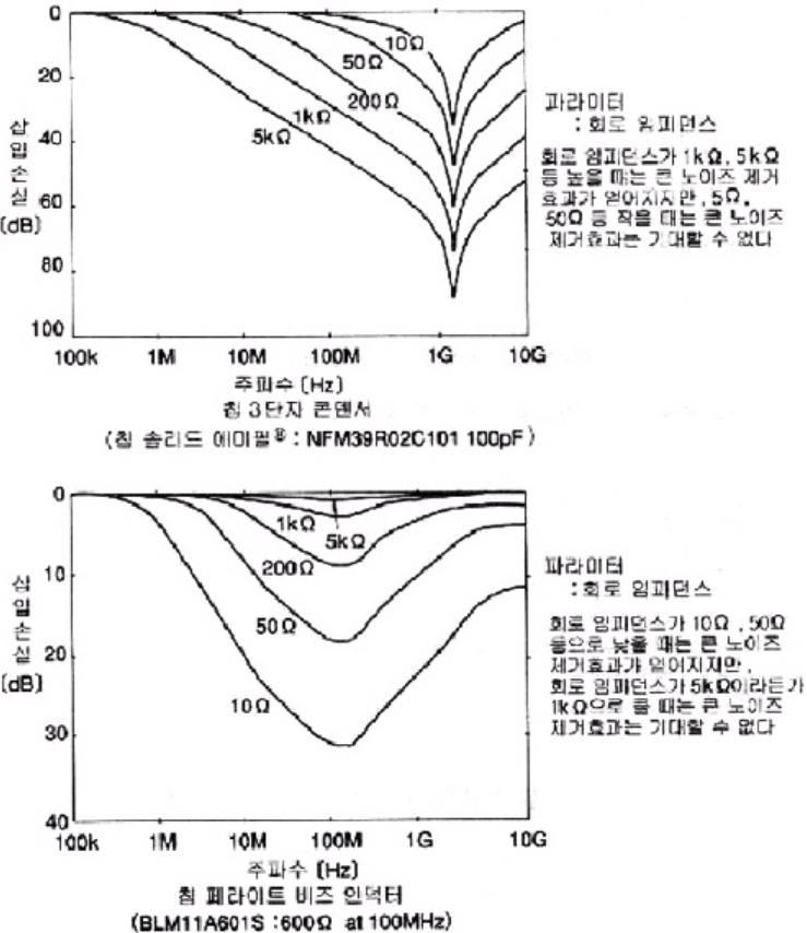 또한 노이즈 대책 부품은 매우 넓은 주파수 대역에서 사용되는 경우가 많으며 사용되고 있는 주파수 특성에 따라서는 콘덴서가 인덕터로서, 동작하거나 인덕터가 콘덴서로서 동작하는 경우도 드물지 않다.