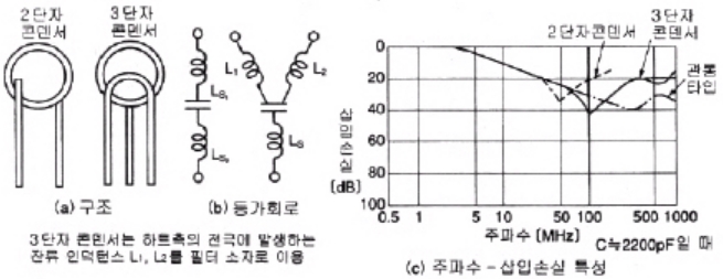 그림1에 나타낸 바와 같이, 수십 MHz까지의 노이즈는 보통의 2단자 콘덴서로 제거할 수 있지만, 자동차의 FM라디오나 디지털 기기의 노이즈 등과 같이 수백 MHz까지의 노이즈 를 제거할 필요가 있는 경우에는 3단자의 콘덴서가 사용되고 있다.