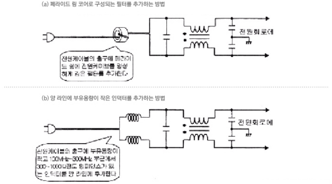 방사노이즈를 개선하기 위해서는 그림3(a)에 나타낸 페라이트 링 코어에 전원선을 1바퀴 또는 2바퀴를 감은 필터, 또는 그림 3(b)에 나타낸 부유용량이 작고 100~300MHz부근에서 300~10000 정도의 임피던스를 가진 인덕터를 양 라인에 1개씩 추가하거나 또는 바이 패스콘덴서의 종류를 바꿀 필요가 있다.