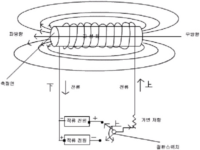 먼저 절환 스위치를 위(上)로 한 후 가변저항을 무한대로 크게 하면 전류가 흐르지 않아 코일에서 나오는 자력선이 없으며 자성체도 착자되지 않은 상태 이므로 측정면에서의 자력선도 없어 [그림2]에서 NG도 S극도 아닌 0점이 됩니다.