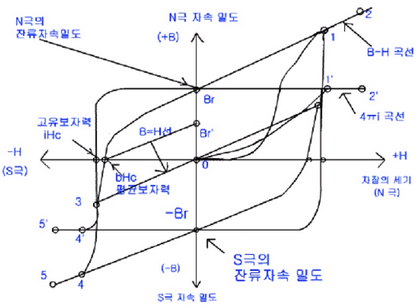 곡선 B-H가 BH 직선과 만나는 점 30 iHc가 되며 4 i곡선은 전류에 의한 반대방향의 외부자계가 작용해도 Br점에서 bHc점 부근까지는 잘 감자되지 않고 견디지만 bHc점보다 큰 코일의 외부자계에서는 급격히 감자되면서 점 3iHc)에 이르러서는 N극도 극도 아닌 상태로 완전히 탈자되어 버리는 것입니다. 계속 전류를 크게 하면 측정면에서 N극이 탈자 되어 자성을 잃어버렸던 것이 정반대의 S극으로 착자 되기 시작하여 코일의 외부자계는 점 4를 지나 점 5와 같이 무한히 커지지만 이때 자석자체의 자속량은 4 mi곡선과 같이 포화점 4 = 점 5'로서 S극의 세기가 더 이상 커지지 않게 됩니다.