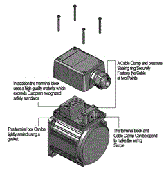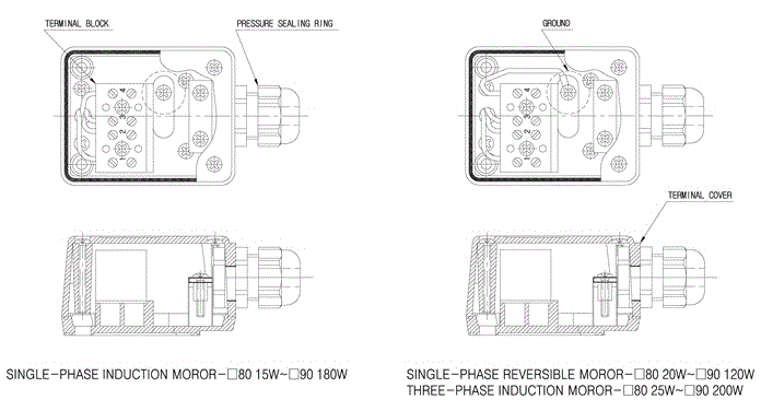 1) Motor의 인출선과 단자는 가혹한 환경에 적합하도록 단자박스에 의해 밀폐되어 있습니다.