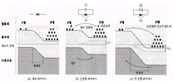 먼저 PN접합이 형성되어 있는 상태에서 그림1 (b)와 같이 전류가 흐르는 방향, 즉 순방향으로 전압을 인가한다. 이것을 순방향 바이어스라 한다. 캐소드 측에 부(-)의 전압이 걸리므로 이 부전위에서 전자의 준위는 올라간다. 마치 물통을 전압으로 들어올린 것과 비슷하다. 이렇게 되면 N형에 있는 자유전자의 에너지 레벨은 P형보다 커져 N형에서 P형으로 전자가 이동한다. 즉 P형에서 N형을 향해 전류가 흐르게 된다. 한편 정공을 보면 마찬가지로 N형에서 P형으로 이동한다.