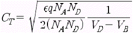 여기서, ε : 재료의 유전율(10~12F/cml, q : 전자의 전하(1,602 x 10~19), NA : 엑셉터 밀도 [ ],ND : 도너 밀도 [ ], VD : 확산전위[V], VB : 바이어스 전압(V] 다이오드에서도 C의 값은 전압에 따라 변화한다.