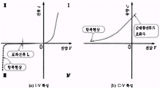 여기서, Is : 포화전류[A], Q : 전자의 전하(1,602 × 10~19)(C), k: 볼츠만 상수(1.38 × 10-23), T : 절대온도 [KI 제 3상한은 역 방향에서 포화전류 Is가 흐르고 있다. 그림 13(b)는 정전용량의 전압 특성 특성이다. 순방향 측은 큰 전류가 흐르므로 콘덴서로 사용할 수 없다. 그러나 역 방향 측의 포화전류값은 작기 때문에 무시되므로 콘덴서로 사용할 수 있다. 그리고 역 방향전압의 크기에 따라 공핍층이 두꺼워지므로 용량값CT는 다음과 같은 식으로 나타난다.