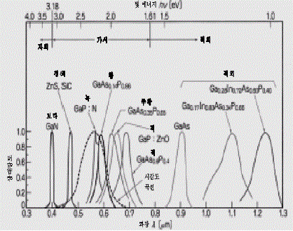 그림4에 각종 발광 다이오드와 그 재료 및 발광 스펙트럼을 나타낸다. Si가 재료로 사용되지 않는 것은 Si가 간접천이 반도체에서 발광효율이 매우 작기 때문이다.