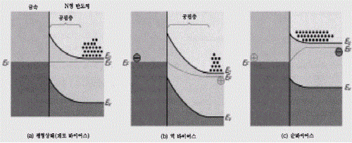 금속과 N형 반도체를 접촉했을 경우 그림6(a)와 같이 공핍층이 발생한다. 역 방향으로 전압을 걸었을 경우에는 그림6(b)와 같이 공핍층이 확산된다.