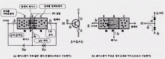 그림2(a)와 같이 B-E 사이와 B-C 사이에는 PN 접합이 각각 형성되어 있다. 먼저 B-E 사이에 순방향, B-C 사이에 역 방향이 되도록 전압을 인가한다. 그러면 B-E 사이는 순방향이므로 전류가 흐른다. 즉, 전자가 이미터에서 베이스로(화살표 방향으로) 흐른다. 그러나 베이스층의 두께는 매우 얇기 때문에 전자는 거의 이 베이스층을 관통하여 컬렉터층에 도달한다. B-C 사이에는 역 바이러스가 걸려 있으므로 컬렉터층에 들어간 전자는 단번에 컬렉터 전극을 향해 확산돼 간다.