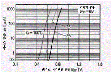 그림3과 같이 VCE를 일정하게 유지했을 때의 VBE와 IB의 관계이고 다이오드의 순방향 특성과 거의 같아진다. 다이오드와 마찬가지로 온도에 의해 대폭 변화된다.