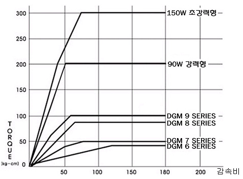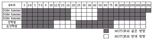 감속기 출력축의 회전 방향은 감속비에 의해 MOTOR의 회전 방향과 동일한 것과 반대 방향인 것도 있다.(표1)