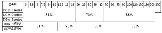 GEAR HEAD의 감속 단수 당 90%를 고려하여 감속 단수가 적은 2단은 81% 정도이며, 감속비가 클수록 감속 단수가 증가하여 3단은 73%, 4단은 66%, 5단은 59%로 저하 된다.(표2)