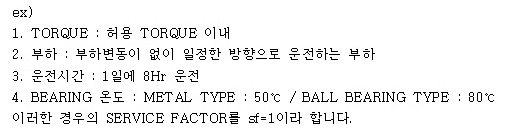 ※ BALL BEARING TYPE의 GEAR HEAD를 하루에 24시간 운전한다면 SERVICE FACTOR를 고려하여 최대허용 TORQUE가 큰 MOTOR와 GEAR HEAD를 선정하여 사용한다.