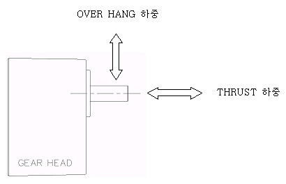 ※산출한 OVER HANG 하중치가 허용치를 초과하면, 축수의 단기 파손, 출력축의 휨, 반복 하중에 의한 피로 파손을 가져오므로 주의하여야 하며 이와 같은 경우에는 OVER HANG 하중에 견딜 수 있는 구조로 설치해야 한다. 또한 출력축에 직접 부하를 취부하는 경우에는 편단 하중 때문에 GEAR HEAD에 가깝게 부하를 취부하는 것이 좋다. 전달 기구에 HELICAL GEAR, WORM GEAR 등을 사용하는 경우에는 OVER HANG 하중과 동시에 TRUST 하중이 작용하므로 TRUST 하중도의 허용치를 초과하지 않도록 사용하여야 한다.