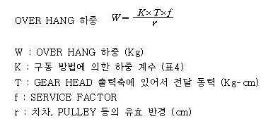 OVER HUNG LOAD는 감속기 연결시 직결방식이 아닌 스프라켓, 기어, 폴리 등으로 연결하여 사용할 때 한쪽으로 작용되는 무리한 힘이나 충격에 의한 하중치를 의미하며 이로 인한 충격이 감속기내부에 전달되어 기어 치면과 베어링에 손상과 더불어 축의 굽힘 현상을 발생 시킬 수 있다. 축단하중을 결정할 경우에는 반드시 출력축의 연결 기구에 대하여 검토하여 O.H.L 연결계수 "K"의 갑싱 적용되어야 한다. 감속기의 수명에 커다란 영향을 주므로, 감속기의 선정, 설치전에 충분히 검토하여야 한다. 입력 혹은 출력축 각각 전동기에 영향을 주는 축단하중은 다음과 같이 계산한다.(표4)