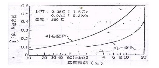- 가열온도를 500~600°C로 하면 질화가 주체인 질화가 되도 질화 시간은 약 30~120분으로 가스질화보다 짧다.
