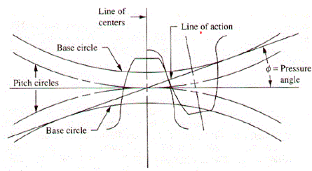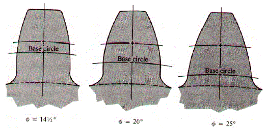 그림에서 피치원에 접하는 접선과 두 기어의 작용선(Line of action)이 이루어지는 각이 압력 각이다. 이 각은 일정한 값을 갖으며 압력각이 달라지면 이의 형상도 변화한다. 다음은 각기 다른 압력각을 가진 기어 이의 모양이다.