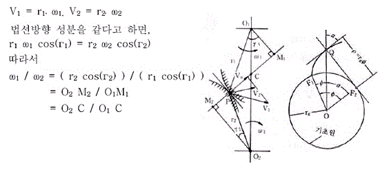 즉, 양기어의 회전수의 비(기어비)로 중심거리를 나누는 점 C를 양 치면의 공통법선을 통과하는 것을 뜻하고 있다. 점 C를 기어에서는 피치점이라 부르고 있다. 이상으로부터 점촉 점에 있어서 치형에 세운 공통법선은 피치점을 통과한다" 라 할 수 있으며 이것을 카뮤(camus)의 정리 또는 치형이 맞물리기 위한 기구학적 필요조건이라고 한다. 위 조건을 만족하는 곡선은 무수히 많고 또, 어떠한 곡선을 사용하여도 관계는 없지만 실용상의 관점에서 2, 3개의 곡선으로 한정된다.